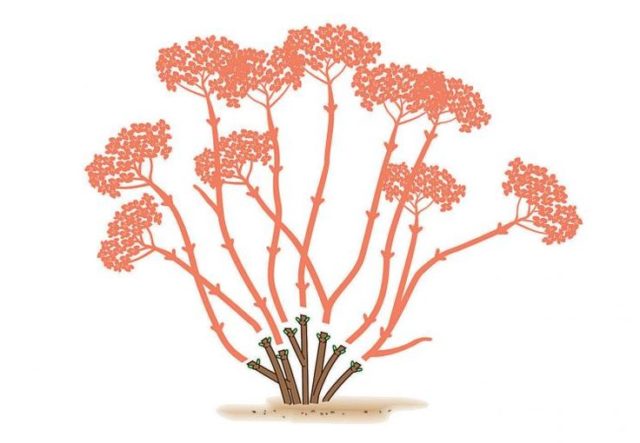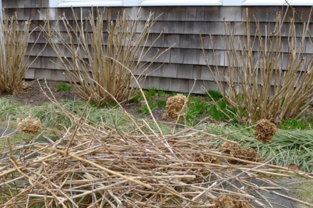 Este método de corte se utiliza para arbustos adultos de hortensias arbóreas que ya han entrado en el momento de máxima floración. Dado que las inflorescencias del arbusto ornamental florecen solo en las ramas anuales, pueden eliminarse por completo en el otoño después de la caída de las hojas.