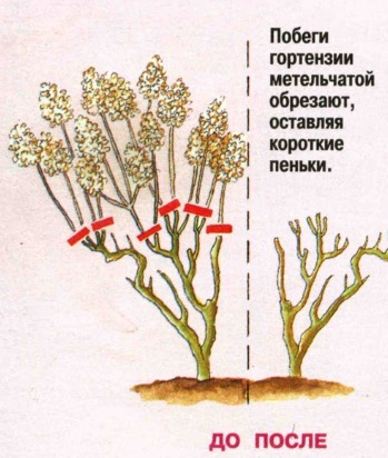 La poda de hortensias de panícula en el otoño se lleva a cabo de acuerdo con el esquema tradicional: es necesario eliminar los pedúnculos, es decir, las panículas. En la siguiente etapa de poda (primavera), se realizan todas las demás acciones: