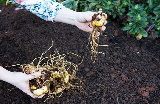 Si sus plantas no se enfermaron con nada durante la temporada, entonces no es necesario someter las raíces a un tratamiento adicional con fungicidas. Tampoco vale la pena cortarlos, son perennes y continuarán creciendo en un lugar nuevo. Pero es muy deseable liberarlo de escamas o raíces podridas o dañadas, si las hay.