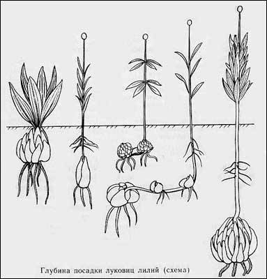 La siguiente pregunta importante es sobre la profundidad de plantación de los bulbos de lirio. Está determinada por el tamaño del bulbo en sí y por la composición mecánica del suelo en el que va a crecer, e incluso por el tipo de lirio en sí. Por ejemplo, muchas veces el lirio blanco como la nieve ya mencionado debe plantarse a una profundidad de no más de 2-4 cm. Se deben seguir recomendaciones similares al plantar especies de Catsby y terracota. Para la mayoría de los lirios, especialmente los híbridos asiáticos, que pueden formar raíces no solo en la parte inferior, sino también en la parte inferior del tallo, debe elegir una profundidad de plantación que sea de dos a cuatro veces mayor que el diámetro de los bulbos. . Los bulbos de lirio con tallos poderosos y altos o pedúnculos grandes (Hanson, Willmott, Henry, rizados) también se plantan con bastante profundidad (de 12 a 20 cm o incluso más).