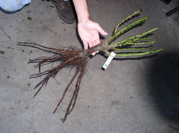 Las raíces no deben estar secas ni podridas. Un sistema radicular sano siempre se desarrolla proporcionalmente y también tiene un color natural y uniforme. Una buena plántula debe tener al menos 3 brotes principales. Las espinas y los tallos tienen un color verde uniforme y un brillo brillante.