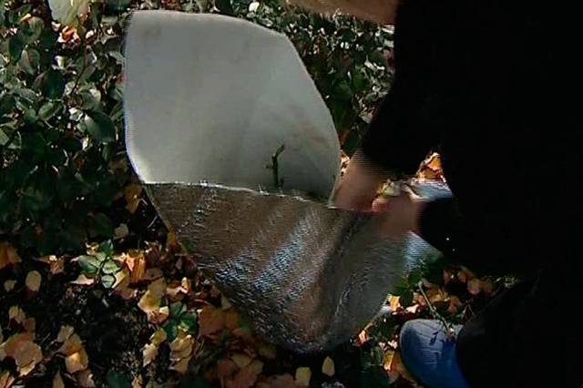 Para tés híbridos y floribundas puede elegir un refugio, dentro del cual se mantiene una temperatura constante en el nivel de -3 grados. Además, una carretera de invierno de este tipo está bien ventilada, lo que tiene un efecto beneficioso sobre el estado de los brotes y raíces de las rosas. Para hacer un refugio de este tipo, es necesario construir un marco en forma de cono de malla a partir de un alambre grueso. La altura del producto debe ser de aproximadamente 60-70 cm (dependiendo del tamaño del arbusto). Un rosal está rodeado por este cono, luego se coloca un aislamiento (lutrasil, cartón, película, etc.) en la parte superior del alambre, que se fija con una cuerda. Sobre el aislamiento, debe estirar polietileno, que debería proteger el arbusto de la precipitación y el viento.Los extremos de la envoltura de plástico se fijan con tierra para que no se abulten y expongan las raíces.