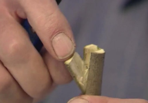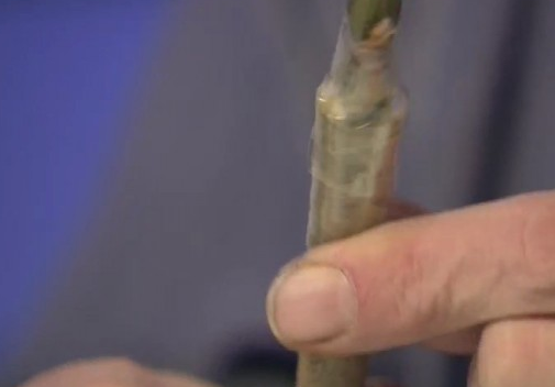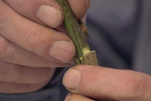 - Es necesario procesar el stock: esta es la parte media del tallo con una hoja y un cogollo bien desarrollado. Se hace un corte recto y luego una hendidura, cuyos parámetros se ajustan para el vástago.