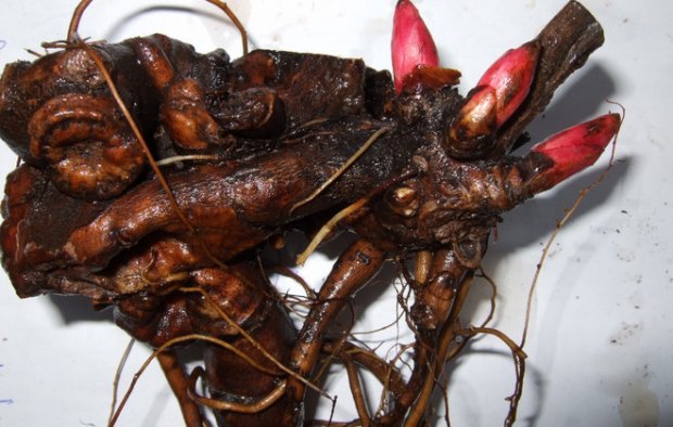 - El suelo se sacude cuidadosamente de las raíces, luego el rizoma se lava cuidadosamente con agua para limpiar los brotes de crecimiento.