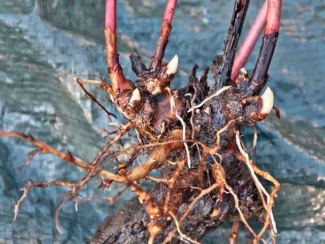 El rizoma seco se corta en varios trozos con una podadora o un cuchillo afilado. Cada una de las divisiones de una peonía con yemas debe retener 2-3 ojos y un par de raíces adventicias de al menos 1 cm de diámetro. El rizoma cortado del arbusto uterino se rocía con carbón en los cortes, al mismo tiempo, durante el procedimiento, se cortan todas las áreas podridas.