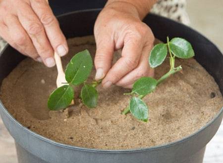 El tallo de una rosa está incrustado en la capa superior de arena de 1,5 a 2 cm. A medida que crece, las raíces se profundizarán en el suelo y comenzarán a alimentarse de la capa inferior de suelo fértil. Se recomienda cerrar el corte en un ligero ángulo con la superficie del suelo. La distancia entre las plántulas en un contenedor debe ser de al menos 8 cm. Después de plantar los esquejes, el suelo debe humedecerse ligeramente rociando la capa superior con una botella rociadora.