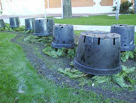 Las hojas o ramas de abeto deben colocarse debajo de la copa. Los brotes superiores también están cubiertos.