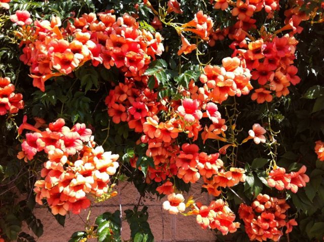 Campsis generalmente se planta en huertos familiares, en áreas de parques para jardinería vertical. La planta tiene raíces aéreas que se adhieren a soportes. Y el follaje tiene un aspecto decorativo debido a placas grandes y complejas de 7-11 hojas con bordes dentados. Durante el período de floración, de junio a septiembre, se forman inflorescencias paniculadas de unos 9 cm de largo y 5 cm de diámetro en la liana. Su color puede ser rosa, carmesí, rojo, naranja. Aunque las flores de la planta no emiten olor, atraen insectos: avispas, abejas, moscas, hormigas.