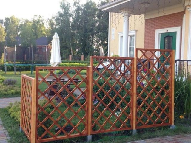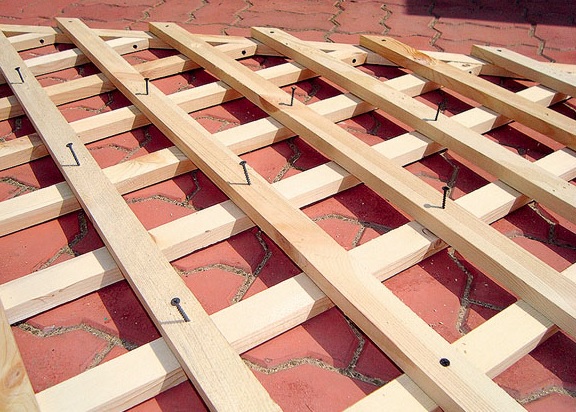 - Hacen un marco rectangular, lo sujetan con tornillos autorroscantes. A lo largo del lado largo, las lamas se colocan a la misma distancia, discurriendo en una dirección diagonal paralelas entre sí.