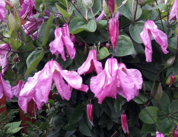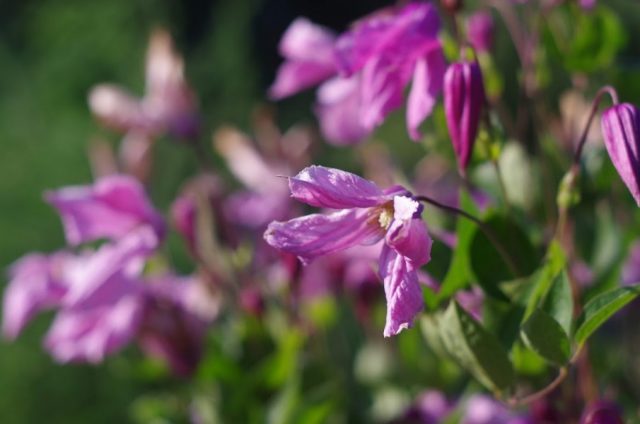 Básicamente, la clemátide Alyonushka es valorada por flores muy hermosas: simples, similares a campanas grandes, de hasta 7 cm de longitud. Las flores de la variedad Alyonushka caen al suelo, aparecen en los brotes a fines de mayo y tienen un delicado color rosa púrpura. Una característica sorprendente de la variedad es que Alyonushka florece continuamente durante todo el verano, hasta septiembre.