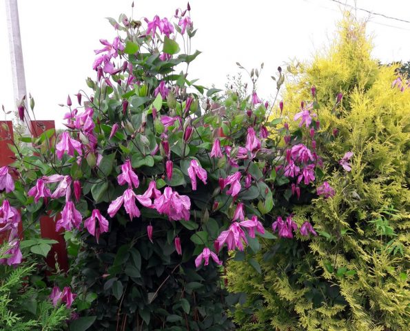 La variedad Alyonushka se convierte en una verdadera decoración del jardín. Gracias a los brotes parecidos a las lianas, la planta a menudo decora cenadores, balcones, vallas y cercas. Clematis también se usa para cubrir el suelo, si no apoya los brotes con soportes, comenzarán a enroscarse a lo largo del suelo, entrelazándose maravillosamente con otras plantas.