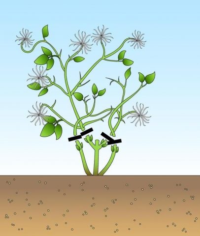 Dado que la clemátide Ernest Markham pertenece al tercer grupo de poda, sus ramas se podan casi hasta la raíz durante el invierno. Solo quedan pequeñas ramitas de unos 12-15 cm de largo con varios brotes por encima del suelo.