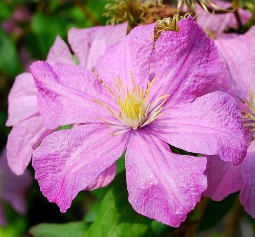 La flor no es doble, consta de 6 sépalos elípticos con un ligero ahusamiento y bordes ligeramente ondulados. El color de los pétalos es rosa con un tono violeta, tradicional de las clemátides. Los pétalos son ligeramente ondulados, con un tono púrpura más intenso de venas que se destacan en ellos. Las anteras son cremosas y los estambres son de color amarillo brillante. Puede establecer semillas individuales, lo que aún no tiene sentido usar para la reproducción. Las flores no tienden a desvanecerse.