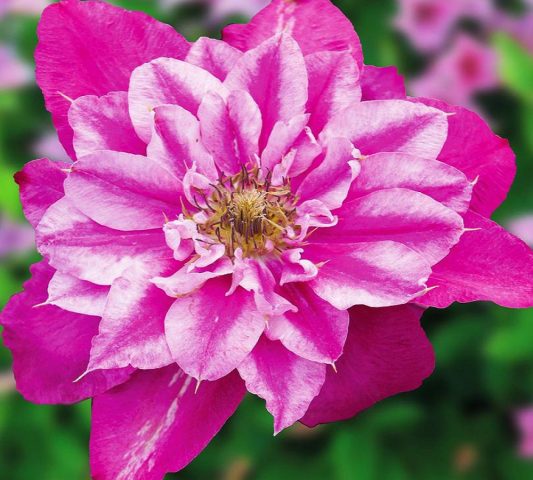 Clematis Mai Darling es una variedad de clemátide sorprendentemente hermosa, criada en Polonia. La planta deleitará a sus propietarios con flores semidobles o dobles, pintadas de púrpura con un tinte rojo. Además, al final del verano, la clemátide, en condiciones favorables, puede florecer por segunda vez.