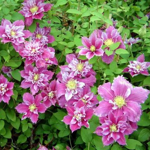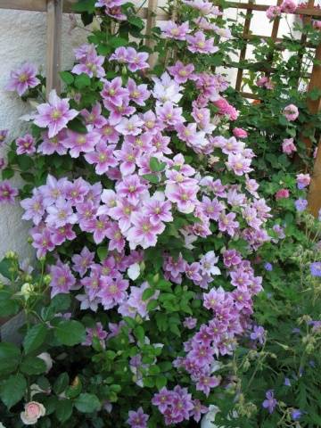 Las mismas clemátides que pertenecen al grupo de transición 2-3 son igualmente abundantes y florecen bien tanto en los brotes jóvenes como en los del año pasado. Es a este grupo de transición al que pertenece la variedad Piilu clematis. La única diferencia es que, como se mencionó anteriormente, durante la segunda ola de floración, no se producen flores dobles en la planta.