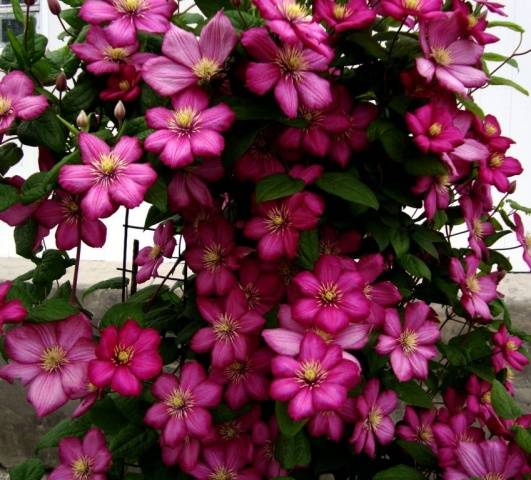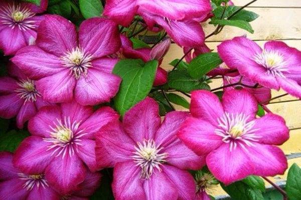 Y florece profusamente a partir de los 3-4 años. Para que la clemátide de la variedad Ville de Lyon se desarrolle por completo, los brotes se distribuyen uniformemente sobre el soporte y se atan con cuerdas. Debemos tratar de asegurarnos de que todo el follaje esté completamente iluminado. Los brotes de clemátide, que se arrastran por el suelo, deben atarse cuidadosamente a un soporte.