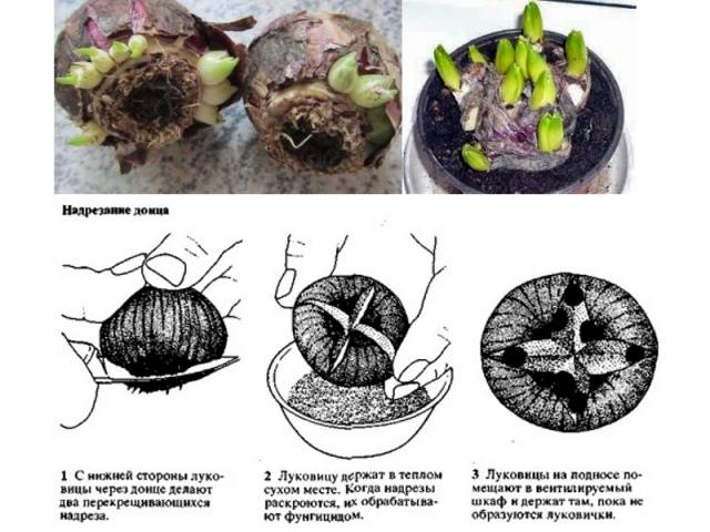 Para esto, se hacen incisiones cruciformes en la parte inferior de los bulbos más grandes; después de un tiempo, aparecerán varios niños allí. Estos procesos se separan y se cultivan en macetas durante varios años.