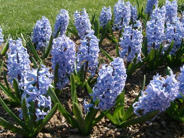 El espacio recomendado entre los bulbos de jacinto adyacentes es de 15-20 cm. Para que las flores crezcan uniformemente, se plantan a la misma profundidad y se eligen cebollas de aproximadamente el mismo tamaño para cada fila.