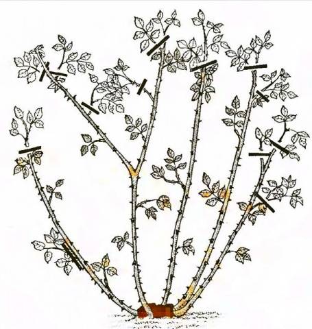 Los brotes fuertes se acortan a la mitad, los debilitados, un poco más. La poda moderada es buena para todos variedades de arbustos... En las rosas floribunda, los tallos viejos se acortan por completo y las anuales solo se pellizcan ligeramente. Tal poda le da al arbusto un aspecto particularmente atractivo y promueve una floración prolongada.