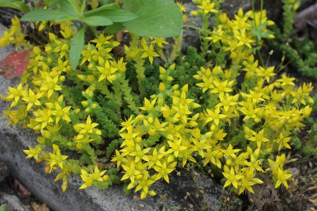 Sedum es cáustico, o sedum no necesita un mantenimiento cuidadoso y crece rápidamente, formando una alfombra natural uniforme.