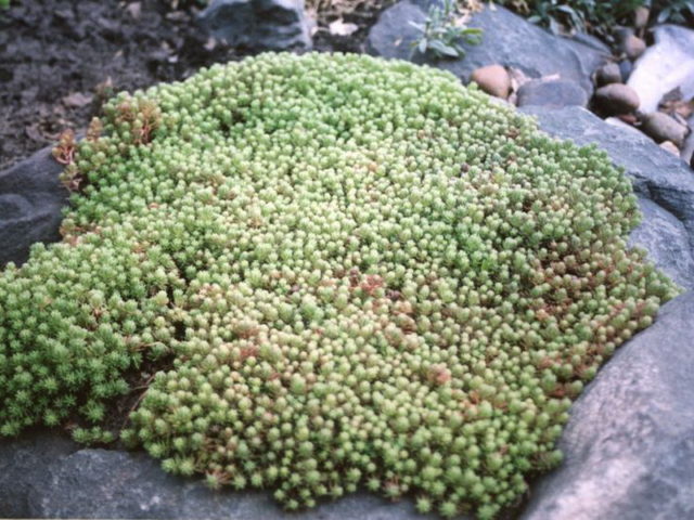 La foto del sedum cáustico "Minus" ilustra el color original de su vegetación.