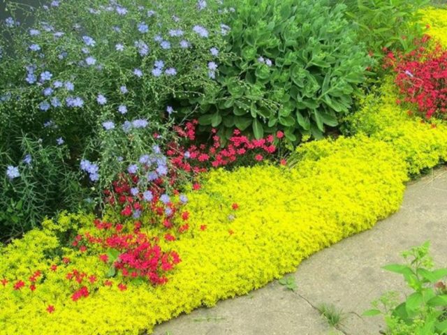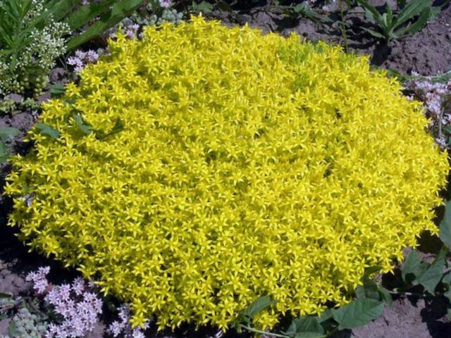 Los matorrales de sedum cáustico sirven como un diseño espectacular para el borde del macizo de flores.