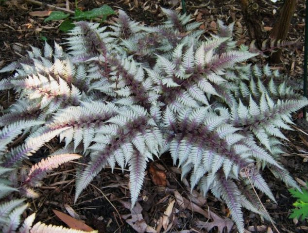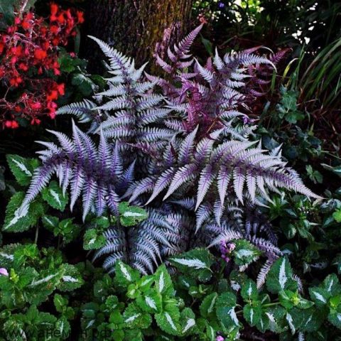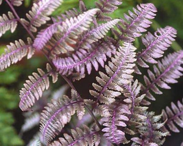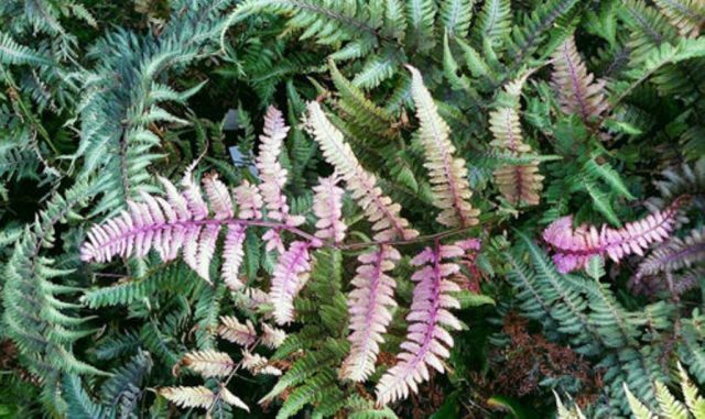 - Belleza roja helecho - una vista baja, la altura alcanza hasta medio metro. Red Beauty es famosa por el color de su follaje decorativo. En la primera mitad de la temporada de crecimiento, se pinta en color rosa púrpura, a medida que crece, el color cambia a púrpura ceniza, más cerca del otoño, la hoja adquiere un color plateado con un tallo púrpura pronunciado. Fern Nipponsky Red Beauty es resistente a las heladas y sin pretensiones. Puede crecer tanto al sol como a la sombra.Pero cuando se cultiva en un lugar bien iluminado, el follaje adquiere un color brillante y rico, que adorna la parcela del jardín desde la primavera hasta la primera helada.