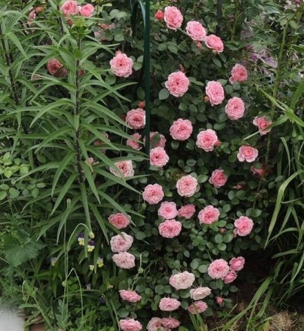 A partir de mini-luces, puede crear un pequeño jardín donde los brotes se ubican verticalmente, descansando sobre árboles, columnas o pilares. Las rosas trepadoras "Eva" se ven interesantes en combinación con otras variedades o flores de tamaño insuficiente.