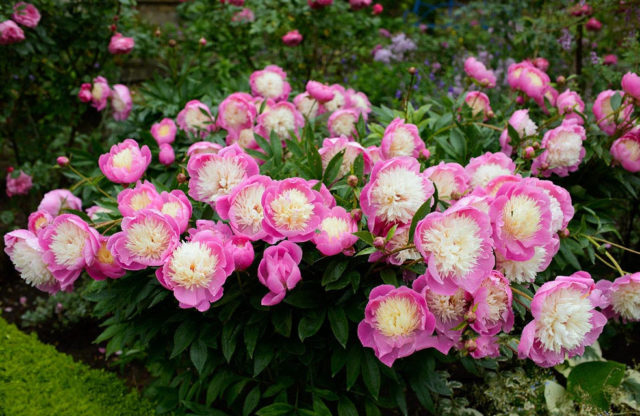 Las más populares son las combinaciones con otros tipos de peonías. Después de haber recogido variedades con diferentes períodos de floración, puede crear un jardín de flores que conserve su efecto decorativo durante mucho tiempo. Y si las plantas florecen al mismo tiempo, el resultado será la composición más brillante de flores de diferentes formas y colores.