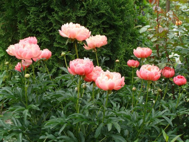 La peonía "Coral Supreme" se ve hermosa, como marco para un camino de jardín, así como en un jardín de flores en combinación con otras plantas perennes.