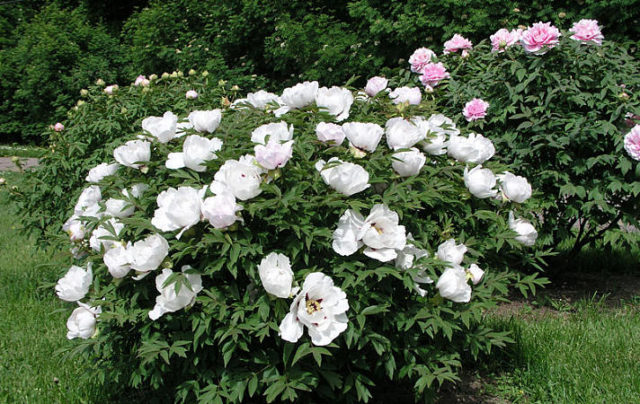 Dado que los arbustos de peonía Gardenia alcanzan tamaños bastante grandes, en las composiciones se plantan en la segunda fila.