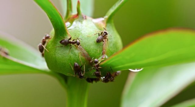 Las hormigas infectan las hojas de peonía y transportan pulgones