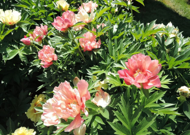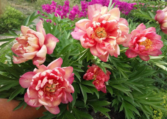 Para crear un juego de contrastes, se plantan plantas ornamentales con follaje pequeño en un área pequeña junto a los híbridos Ito. O las peonías tridimensionales se encuentran cerca de árboles grandes. La ternura de los brotes de colores pastel se enfatizará con la rica vegetación de los arbustos de enebro.