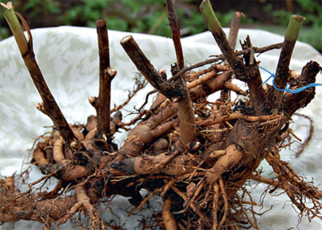 - La peonía se desentierra y la tierra se sacude suavemente de las raíces o se lava con agua de una manguera.