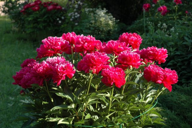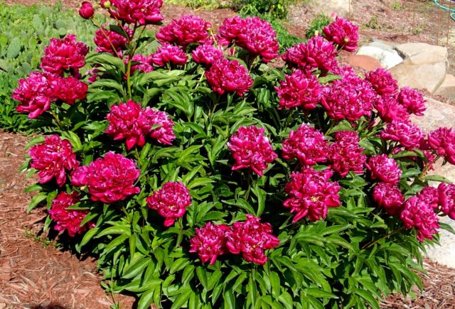Por su decoración, la peonía de Kansas recibió una medalla de oro. Los tallos son largos, uniformes, aptos para cortar. La peculiaridad de la variedad Kansas es que cuantas más flores se cortan, más magnífico y brillante será el color de las siguientes.