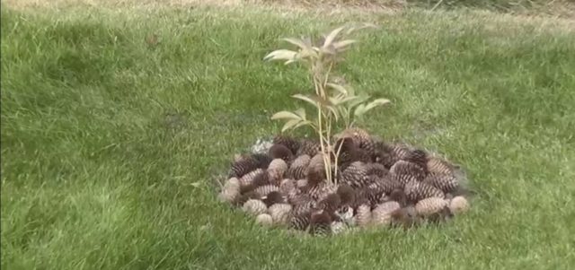 - Se cubren con tierra y se riegan, el círculo de raíces se cubre con cualquier material, los conos de coníferas se pueden usar con fines decorativos.