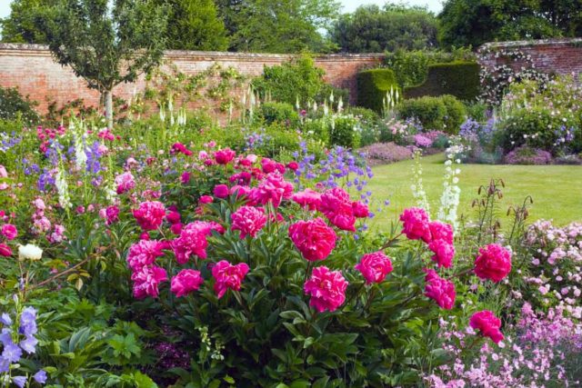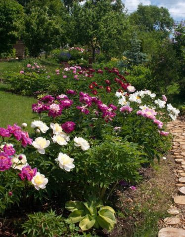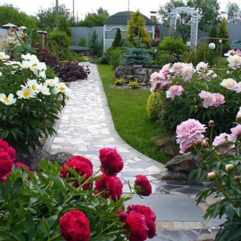 Las peonías enfatizan el efecto decorativo de los arbustos en flor.
