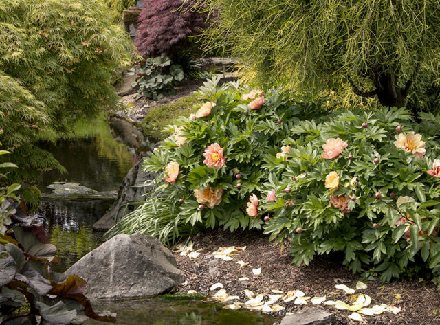 Collis Memory Peony es un arbusto extenso con troncos fuertes. Da varias hermosas y delicadas flores de albaricoque con toques de cereza. Collis Memori tiene una buena resistencia al invierno: puede soportar heladas invernales de hasta -35 ° C. Esto permite que se cultive en casi cualquier región de Rusia.