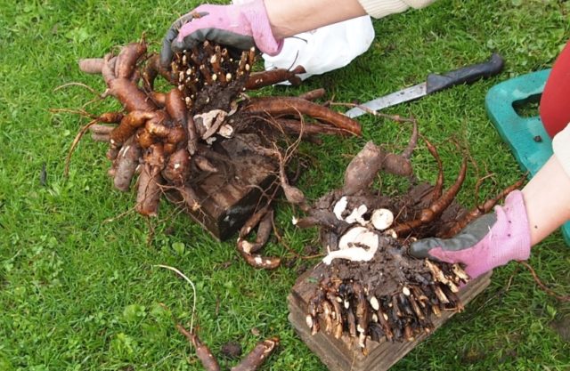 Puedes compartir un arbusto a la edad de 4-5 años. El procedimiento comienza a principios de septiembre, aproximadamente un mes antes de la primera helada. El arbusto se extrae con una pala afilada, el rizoma se limpia del suelo y se corta con un cuchillo para que haya 2-3 brotes sanos en cada corte. Se plantan en el suelo con un intervalo entre plantas de 50-70 cm.