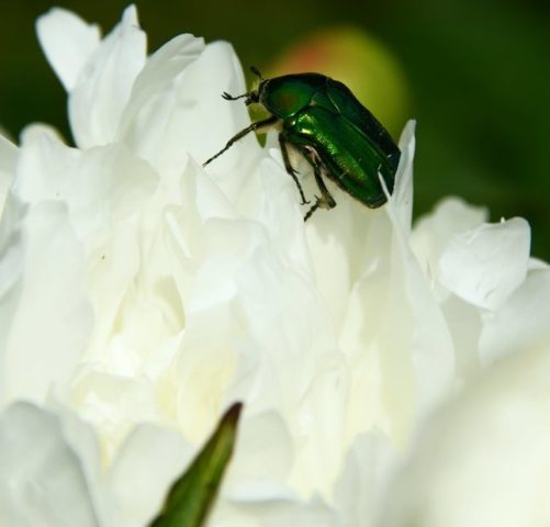 Peligroso para la peonía es el bronce dorado. El escarabajo alcanza los 2,3 cm de longitud. Se alimenta de pétalos, hojas, tallos. Los escarabajos deben recolectarse a mano; se pueden usar insecticidas durante el período de gemación.