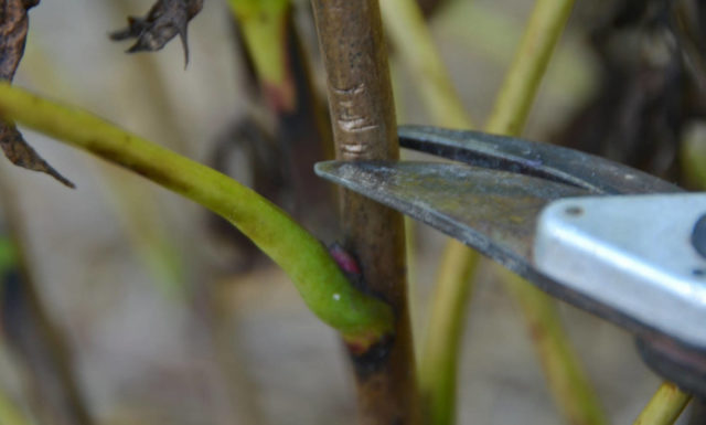 Antes del clima frío, la peonía Laura Dessert requiere poda. Los tallos se cosechan hasta el suelo y luego se rocían con tierra seca. Esto debe hacerse a mediados de octubre, dejar 1-2 cm por encima de los riñones.