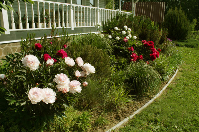 Con una plantación grupal, la distancia entre los arbustos de peonías Marie Lemoine se deja 1-1.5 m, ya que la planta está creciendo activamente.