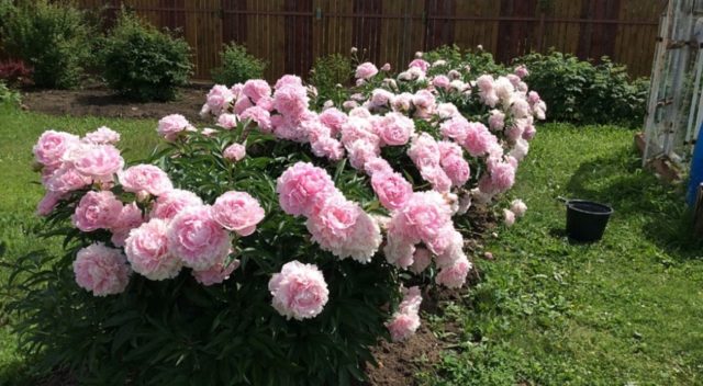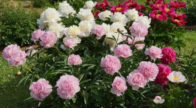 Los lirios, las coníferas altas y otros arbustos de hoja caduca decorativos pueden convertirse en el fondo de una peonía. Además, esta planta se verá orgánica en combinación con un césped verde.