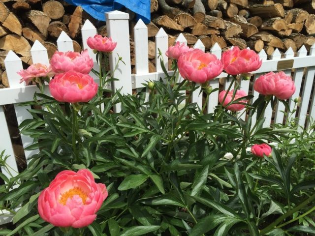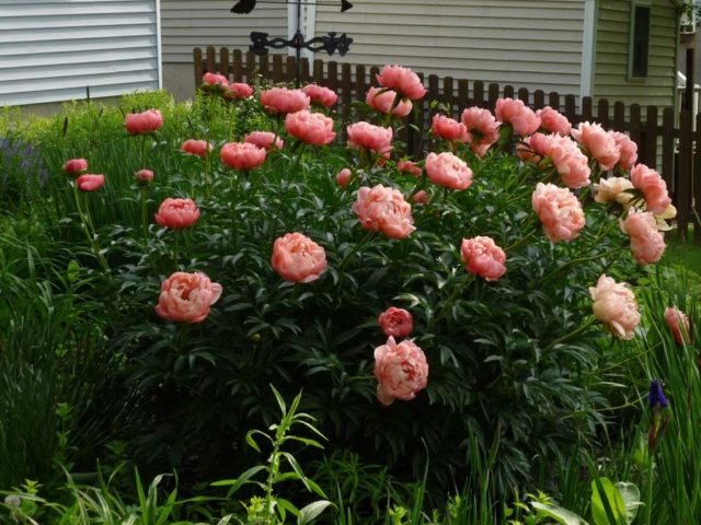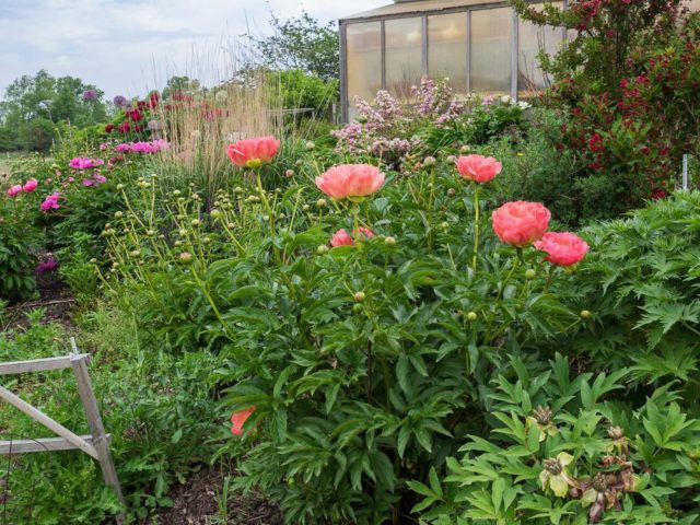 Las peonías son buenas en grupos de flores, donde crecen 3-5 plantas perennes, floreciendo a su vez. Al decorar las pistas, la peonía Pink Hawaiian Coral se combina con: