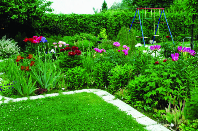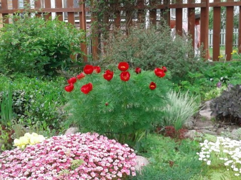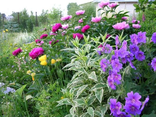 La peonía de hojas delgadas va bien con otros representantes de plantas perennes en flor.