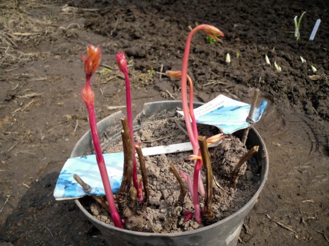Las plántulas de peonía de hoja fina Rubra Plena aparecen ya en abril, cuando el suelo se calienta a una temperatura de +6 ° C. Durante el mes siguiente, se produce la formación de la parte aérea superior, después de lo cual aparecen los brotes.