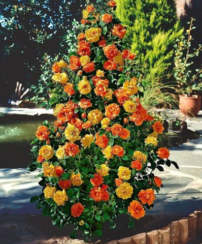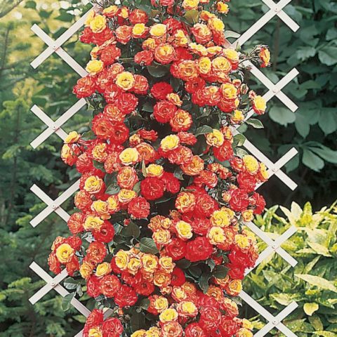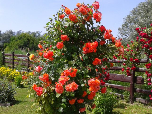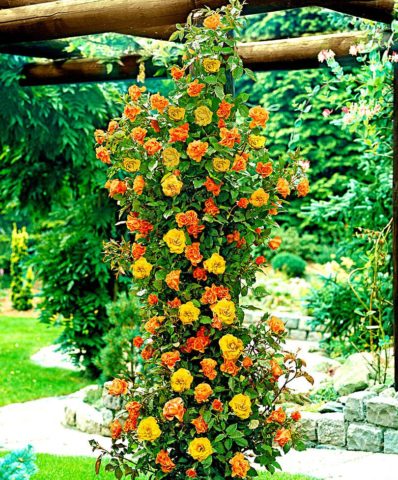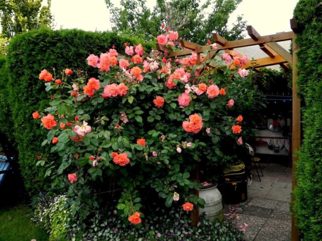 La rosa de rumba se cultiva cerca del soporte. Escalar floribunda es una buena opción para el paisajismo vertical en el jardín y en el patio trasero. La variedad se usa con mayor frecuencia: