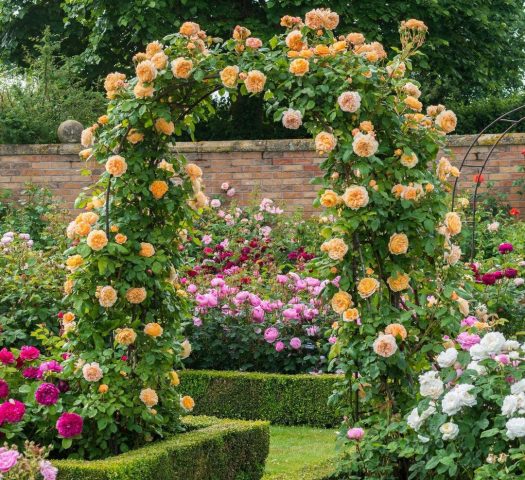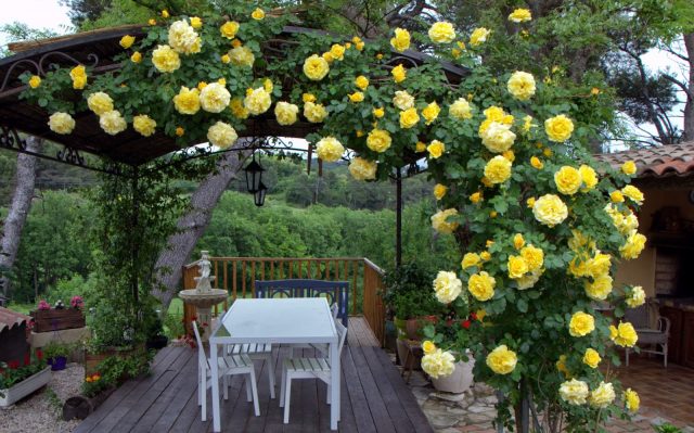 Lluvias doradas de rosas trepadoras en diseño paisajístico