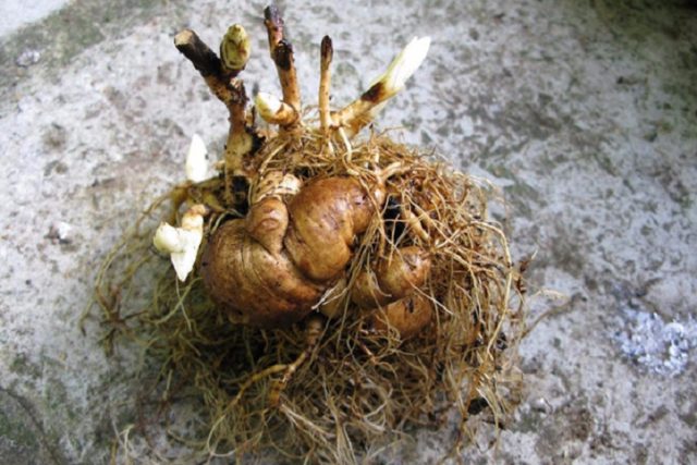 - Los rizomas no son largos, de tamaño mediano con bordes engrosados. El sistema de raíces de los Voronets se asemeja a los tubérculos de papa: conos oblongos en patas cortas.