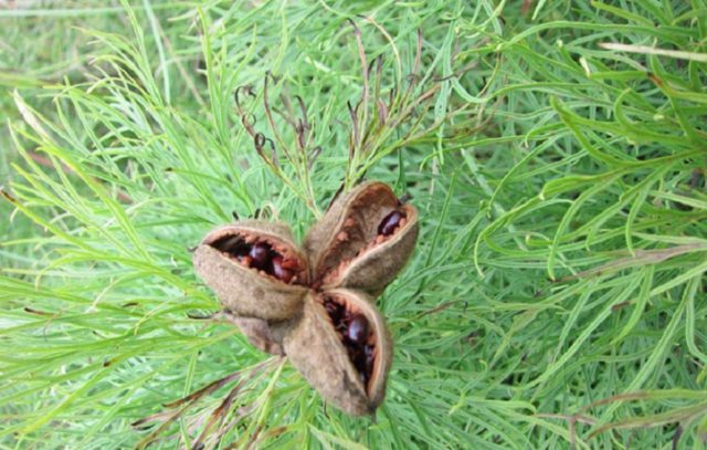 - Sembrando semillas. Este método se usa con menos frecuencia. La germinación del material de siembra no es muy alta, incluso cuando se compra en una tienda. La ventaja del método es una gran cantidad de nuevas plántulas de Voronets en comparación con dividir el arbusto. Un arbusto de peonía de hoja estrecha de pleno derecho resultará en 4-5 años, las plántulas aparecerán en 2 años. Las semillas deben cosecharse en una etapa inmadura cuando la cápsula aún está cerrada. En este caso, la germinación será mejor. Ponlos inmediatamente en el frigorífico hasta la siembra. La época de siembra es otoño (octubre-noviembre) o invierno. En invierno es más difícil y más largo, se requiere paciencia. Pero las plántulas son más fuertes y saludables. Las semillas recolectadas de una planta de hojas delgadas se pueden sembrar en el lecho del jardín de inmediato. Primero, solo necesita desenterrar y fertilizar el suelo. Las plántulas rara vez aparecen en la primavera siguiente, generalmente después de un año.